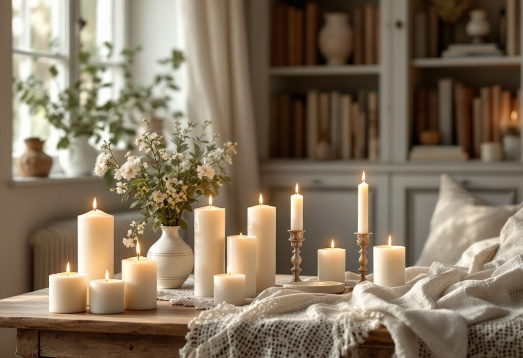 - Bougies-votives : Compactes et polyvalentes, parfaites pour créer une atmosphère chaleureuse lors d’un dîner intime.